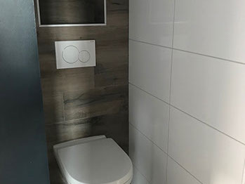 Luxuriöses Badezimmer mit ebenerdiger Regendusche und Handbrause, beheiztem Spiegel, Waschbecken, Toilette und Handtuchheizkörper.
