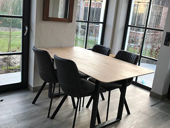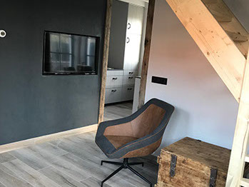 Gemütliche Küche mit Esstisch und Stühlen, Kochinsel mit Induktionskochfeld. Darüber hinaus gibt es ausreichend Stauraum, Kombimikrowelle und Kühlschrank mit Gefrierfach.